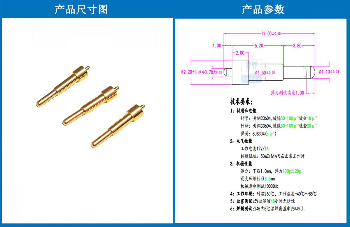 產(chǎn)品頭型:探針外徑為1.5mm,總長(zhǎng)度為11mm、針的兩端的頭型為圓頭